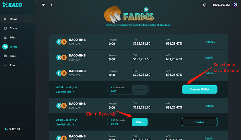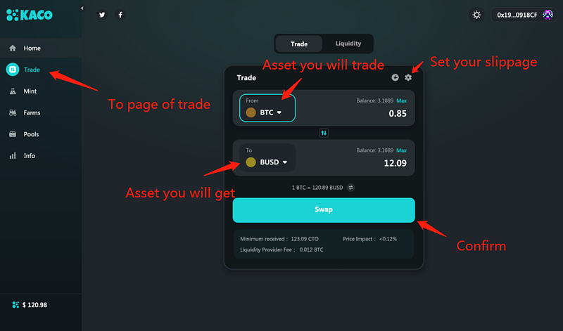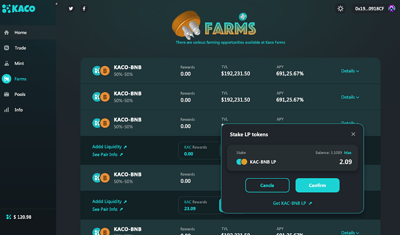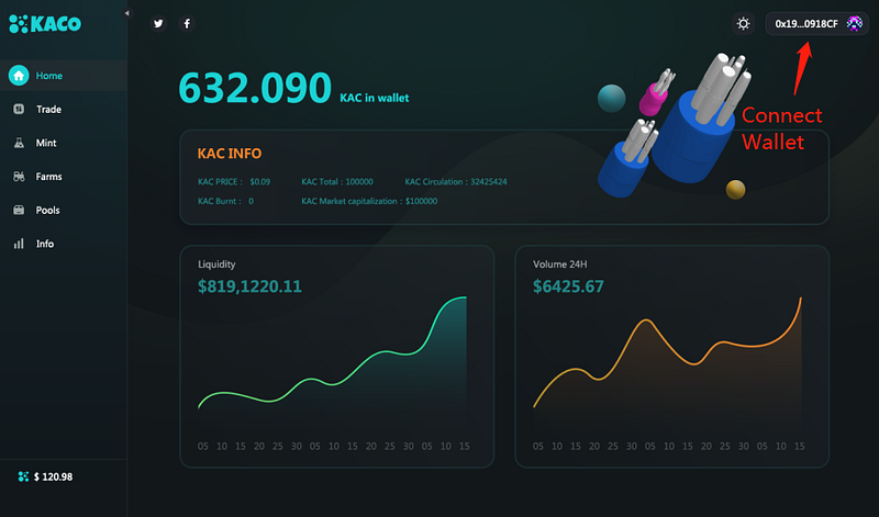 First of all, you need to recharge your MetaMask account or purchase KACO, BNB (the amount ratio is 1:1, for example, 1000BUSD, 1000USDT)